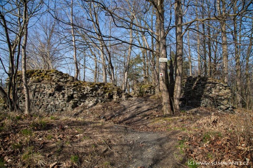 Zřícenina hrádku (tvrze) na strmém vrchu nad řekou Úhlava, 1,5 km od Švihova.